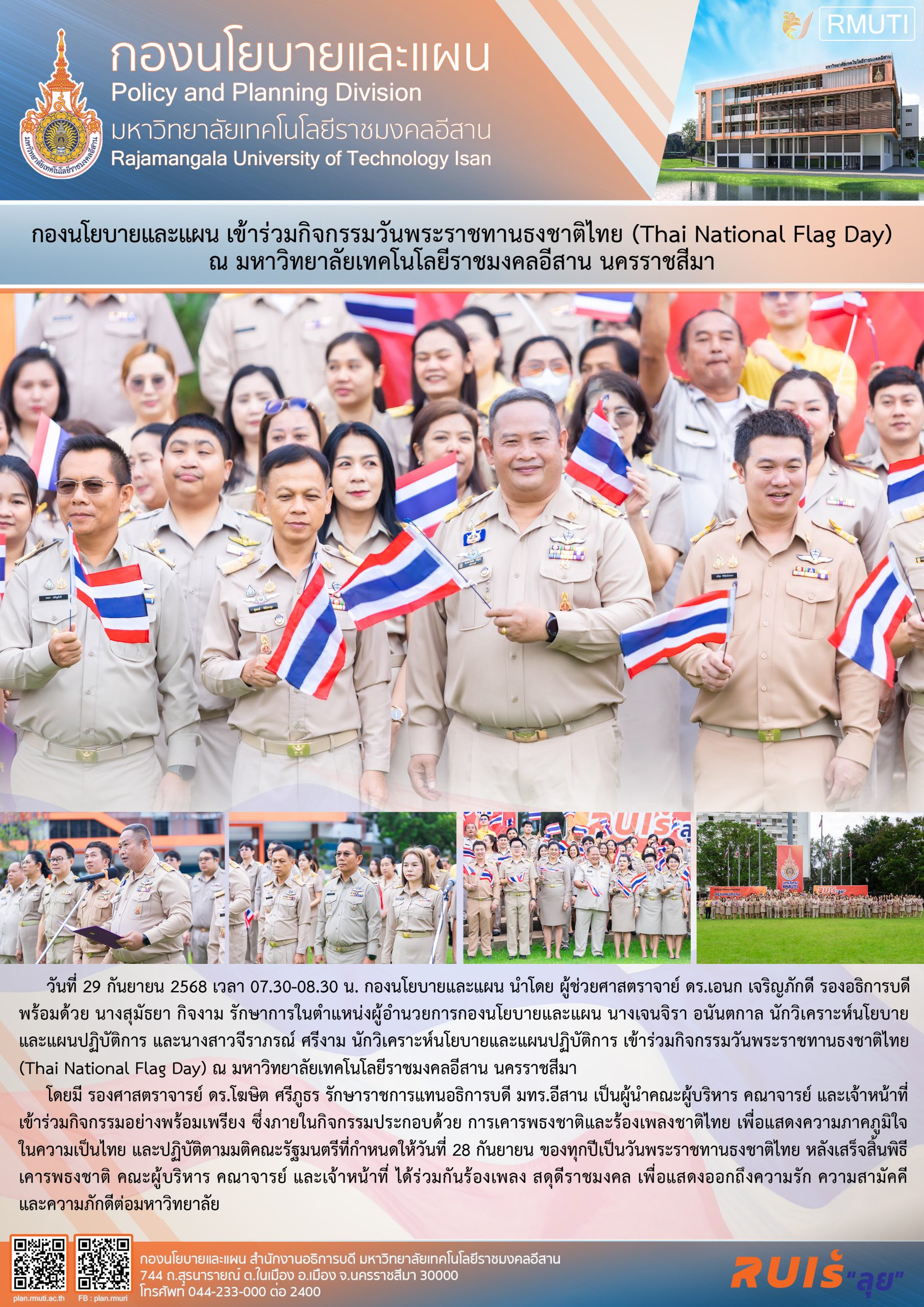 วันที่ 29 กันยายน 2568 เวลา 07.30-08.30 น. กองนโยบายและแผน นำโดย ผู้ช่วยศาสตราจาย์ ดร.เอนก เจริญภักดี รองอธิการบดี พร้อมด้วย นางสุมัธยา กิจงาม รักษาการในตำแหน่งผู้อำนวยการกองนโยบายและแผน นางเจนจิรา อนันตกาล นักวิเคราะห์นโยบายและแผนปฏิบัติการ และนางสาวจีราภรณ์ ศรีงาม นักวิเคราะห์นโยบายและแผนปฏิบัติการ เข้าร่วมกิจกรรมวันพระราชทานธงชาติไทย (Thai National Flag Day) ณ มหาวิทยาลัยเทคโนโลยีราชมงคลอีสาน นครราชสีมา
